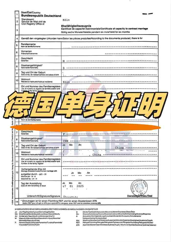 如果你的伴侣是德国籍,打算在中国民政局登记结婚,千万别忽略一份核心文件 —— 德国单身证明(德语:Ehefähigkeitszeugnis)及其海牙认证(Apostille)。少了这张经过合规认证的文件,婚姻登记流程会直接卡住,甚至无法顺利领证。这篇攻略就把办理逻辑、关键细节和注意事项一次性说透,帮你少走弯路! 二、先搞懂:德国单身证明(Ehefähigkeitszeugnis)是什么? 德国的单身证明和国内的 “无婚姻登记记录证明” 作用一致,但有个重要区别 ——这份证明上会明确标注结婚对象的个人信息(比如你的姓名、国籍、身份证号等)。 这意味着办理前必须提前准备好双方的核心材料(比如你的护照 / 身份证复印件、双方关系说明等),确保信息准确无误,避免因信息不符导致证明无效。 另外要注意:这份证明是由德国当地相关部门出具的官方文件,仅在德国境内有效,要拿到中国使用,必须完成后续的海牙认证,否则国内婚姻登记机关会不予认可。 三、关键步骤:海牙认证(Apostille)怎么办理? 1. 为什么必须办海牙认证? 海牙认证(Apostille)是为了简化跨国文件的核验流程,由海牙公约成员国的官方机构出具的 “认证证明”,相当于给国外文件贴了一张 “中国认可” 的标签。 德国和中国都是海牙公约成员国,因此德国单身证明要在中国使用,海牙认证是必经步骤,少了这一步,民政部门会直接拒绝受理。 2. 办理部门 & 流程 很多人会误以为要去德国驻华使馆办理,其实不用!德国单身证明的海牙认证部门是德国当地的市政厅(Rathaus),具体流程如下: 第一步:在德国当地申请并拿到正式的单身证明(Ehefähigkeitszeugnis); 第二步:携带单身证明原件,前往出具证明的市政厅申请海牙认证; 第三步:市政厅审核后,会在单身证明上附加一页海牙认证贴纸(Apostille),完成认证后返还给申请人。 整个流程在德国当地办理,一般 1-2 周可完成,建议提前 1-2 个月规划,避免耽误领证时间。 四、国内收尾:核验 + 翻译,缺一不可 拿到 “单身证明 + 海牙认证” 的组合文件后,还不能直接去民政局,必须完成最后两步:1. 文件核验 根据中国婚姻登记部门的要求,国外出具的婚姻相关文件(包括单身证明),需要先经过中国驻外使领馆或指定机构核验(部分城市可线上核验,具体以当地民政局要求为准)。 核验的目的是确认海牙认证的真实性,确保文件不是伪造的,建议提前联系当地民政部门咨询核验地点和所需材料(一般需要原件 + 复印件、双方护照等)。 2. 合规翻译 国外文件的中文翻译有严格要求:必须由有资质的翻译机构出具翻译件,且翻译件上要加盖翻译机构的公章和翻译专用章。 不能自己翻译,也不能找无资质的个人翻译,否则民政部门会认定翻译件无效。建议选择正规的涉外翻译机构,翻译时要确保个人信息、认证信息与原件完全一致,没有错别字或漏译。五、避坑提醒 提前确认结婚对象的信息:单身证明上的结婚对象信息必须和你的身份证 / 护照信息完全一致,姓名拼音、证件号不能出错; 海牙认证不能代办:一般需要本人或委托德国当地的亲友办理,具体代办要求可咨询当地市政厅; 翻译机构要合规:选择有 “涉外翻译资质” 的机构,翻译后保留好翻译机构的资质证明,部分民政局可能会要求提供; 提前咨询当地民政局:不同城市的婚姻登记部门对文件核验、翻译的要求可能略有差异,建议领证前 1-2 周电话咨询,确认所有材料齐全。