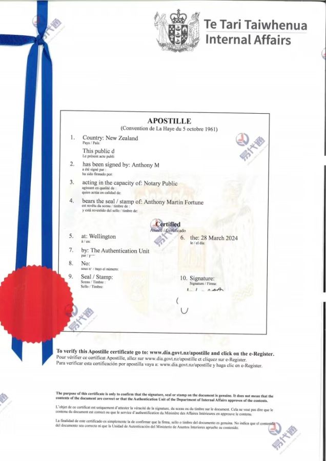 以前新西兰文件拿到中国或其他国家用,又要跑公证又要跑使馆,来回折腾大半个月,还总怕漏材料被打回!现在好了,看完这篇保姆级教程,全程线上操作,不用出门,小白也能一次搞定,再也不用求别人~ 先给大家划个重点:中国在2023年正式加入《海牙公约》,这意味着新西兰的文件要来中国使用,再也不用多跑一步大使馆认证了!只需要办一份新西兰海牙认证,就能直接生效,省了超多麻烦事! ✅ 必看!新西兰海牙认证核心流程(小白直接抄作业) 很多人以为流程很复杂,其实就2步,全程线上能办,不用到现场,记好这两步,不踩坑! 1. 新西兰律师公证:先找新西兰持牌公证人(可线上联系正规公证机构),对需要认证的文件进行公证,确认文件真实有效、签字属实——这里要注意,非官方文件(比如毕业证、合同)必须先公证,跳过这步会直接被驳回哦⚠️ 2. 新西兰外交部(内政部)附加证明书:公证完成后,将文件提交到新西兰内政部(DIA),办理海牙认证(也就是Apostille附加证明),相当于给文件办一张“国际通行证”。 关键补充(小白必看) ⏰ 办理周期:通常约8个工作日左右(普通件),赶时间的宝子可以选加急服务,3-5个工作日就能出结果; 翻译要求:如果文件是英文,来华使用需提供官方认可的中文翻译件(要翻译机构盖章+签字,自己翻译无效); 适用范围:不只是中国认可!新西兰文件办理海牙认证后,可在全球120多个海牙成员国直接使用,不用再额外办认证。 ✅ 延伸:新西兰文件去其他国家使用,该怎么选? 很多宝子会问,除了中国,文件去其他国家能用吗?答案很简单,看目的地国家是不是海牙成员国,分两种情况,一看就懂: 目的地是海牙成员国(比如美国、澳大利亚、日本等):直接办新西兰海牙认证就够了,流程和上面一样,不用多花钱多跑腿; 目的地是非海牙成员国:需要办理新西兰三级认证,先公证、再经内政部认证,最后送往该国驻新西兰大使馆进行领事认证。 常见需三级认证的国家(记好别跑错): 阿联酋、泰国、科威特、马来西亚等,这些国家不认可海牙认证,必须走三级认证流程,别白跑一趟哦! 高频刚需!常见公证认证文件清单(对号入座) 很多小白不知道自己的文件能不能办,整理了最常见的两类,对照看就好,不用再反复问人: 民事类(个人常用,留学/移民/生活必备) 护照、绿卡(PR卡)、出生证明、结婚证、离婚证、单身证明、无犯罪记录证明(需先向新西兰警方申请,1-2周出结果)、学历学位证书、成绩单、职业资格证、委托书、声明书、遗嘱、亲属关系证明等; 商业类(企业跨境必备) 公司注册证书、公司章程、商业合同、授权书、法人资格证明、商标证书、产品认证、发票、报关单、资信证明、会议记录等,其中百万新元以上合同需额外附银行资信证明。 小白避坑指南(必看!少走弯路) 1. 别跳过公证:非官方文件(毕业证、合同等)必须先公证,再办海牙认证,顺序不能乱,否则直接驳回; 2. 别提前太早办:无犯罪记录等文件通常6个月内有效,提前太久办会过期,白花钱重办; 3. 扫描件要清晰:提交的文件扫描件需清晰无遮挡、无涂改,模糊会导致审核失败; 4. 懒人福利:没时间盯进度的宝子,可找正规代办(服务费约680-1250元/份),全程躺平等收证。 最后总结一下:新西兰文件跨国使用,先看目的地是不是海牙成员国,是就办海牙认证(2步线上搞定),不是就办三级认证!全程不用跑现场,材料备齐,小白也能一次过~