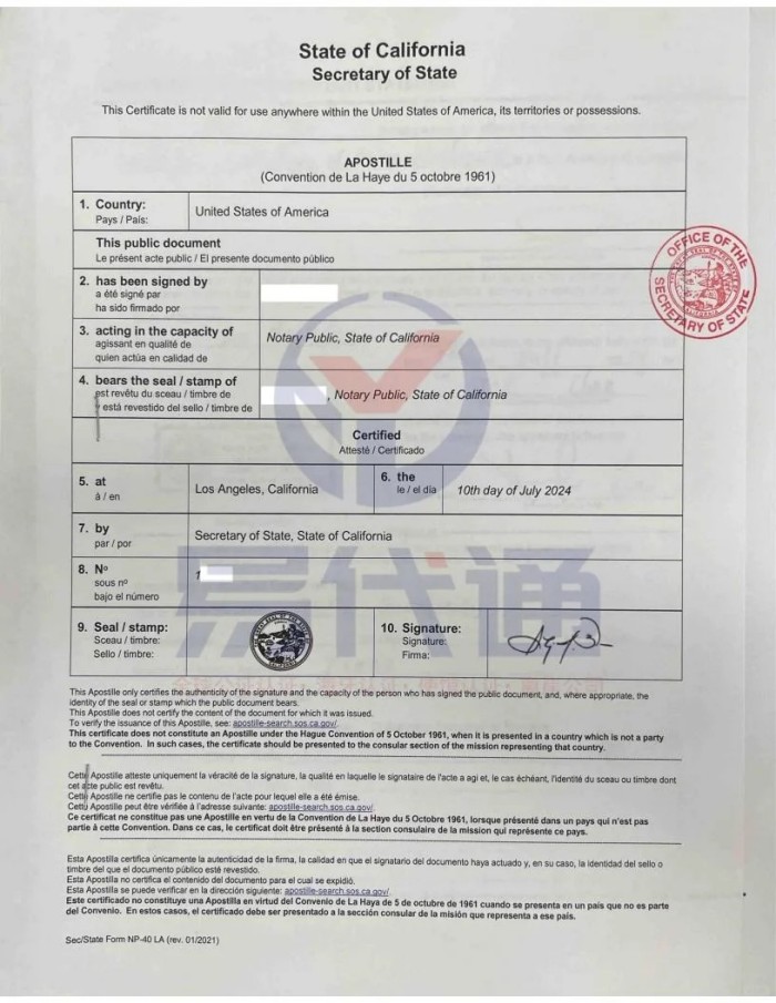 州务卿会对公证员的资质和公证文书的真实性进行核查,核查通过后,将在文件上附加一份Apostille证明书,这份证明书是海牙公约成员国之间相互认可的“官方认证标识”,有了它,证书就能在国内直接使用。