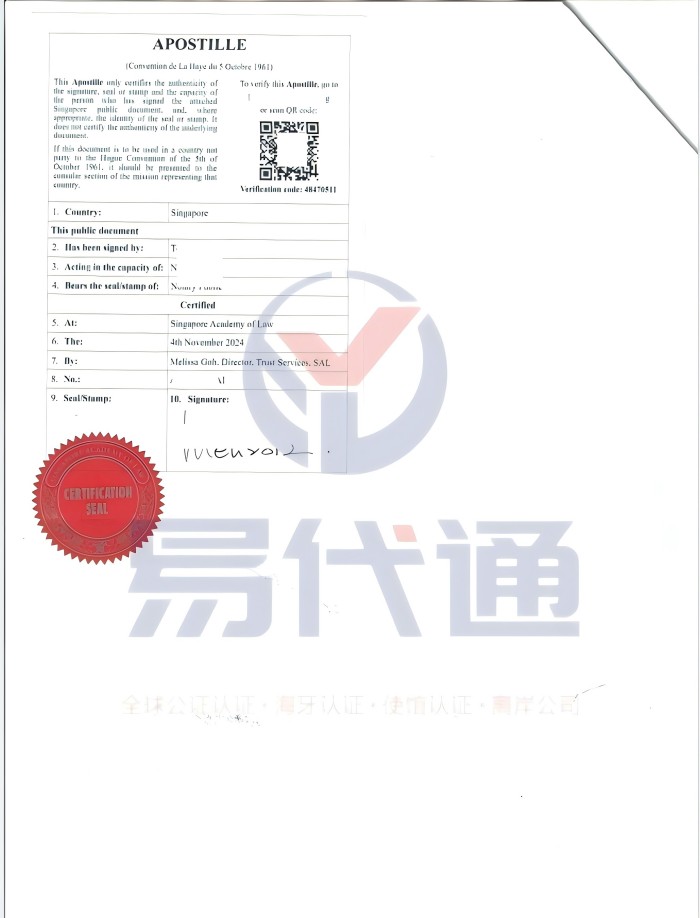 公证完成后,将公证好的声明书提交到新加坡法律协会,申请海牙认证(Apostille)。审核通过后,会加盖海牙认证专用章,至此整个认证流程就完成了。